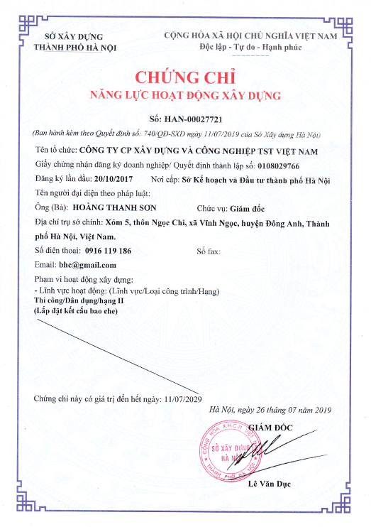 CÔNG TY CỔ PHẦN XÂY DỰNG VÀ CÔNG NGHIỆP TST VIỆT NAM là doanh nghiệp hoạt động trong trong lĩnh vực xây lắp công trình dân dụng và công nghiệp, thi công lắp đặt nhôm kính. Chúng tôi luôn khắc ghi giá trị của mình là tạo ra ngày một nhiều các giá trị cho mỗi cá nhân, cho mỗi tổ chức và góp phần nhỏ bé của mình vào sự phát triển chung của xã hội.